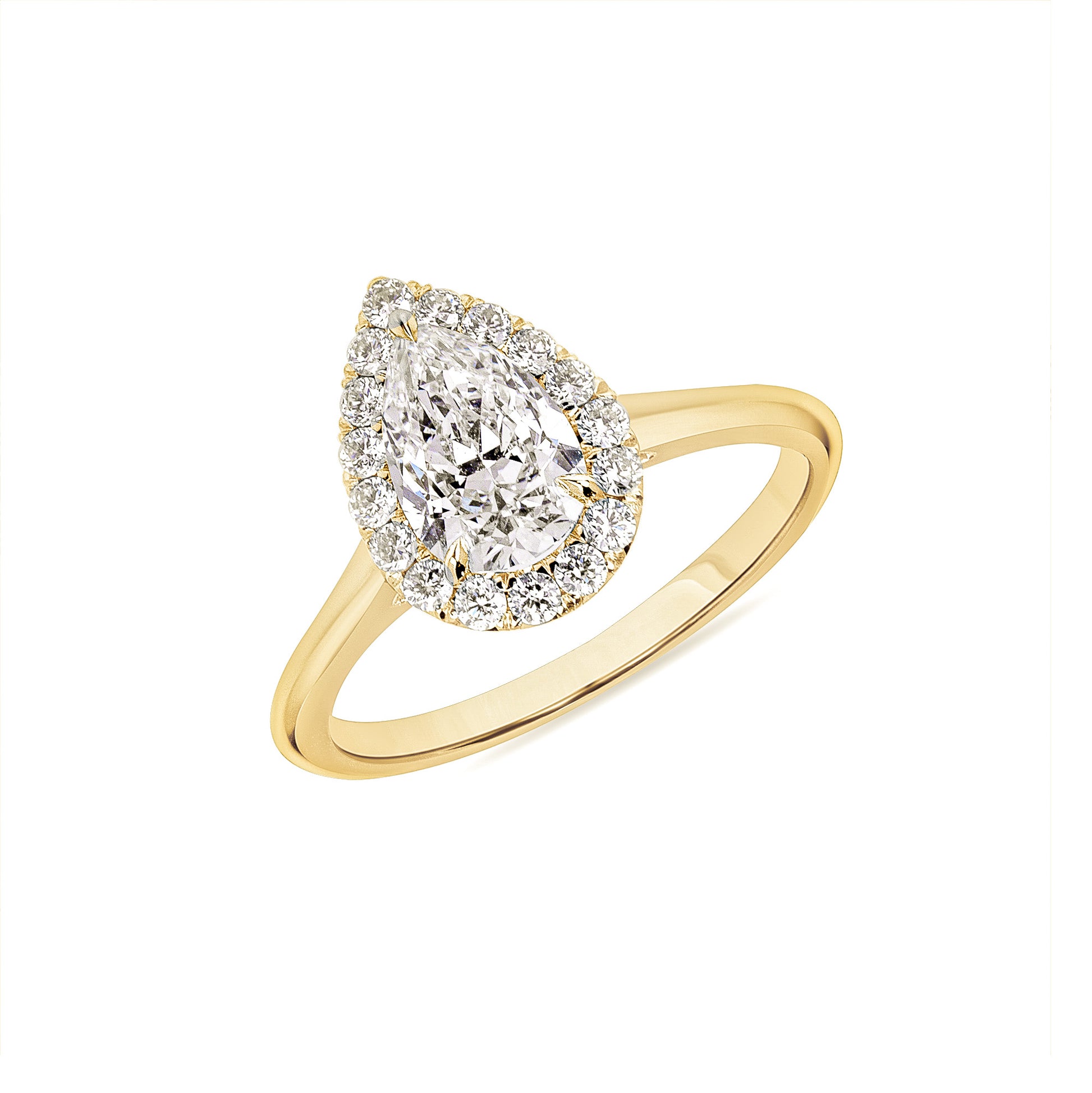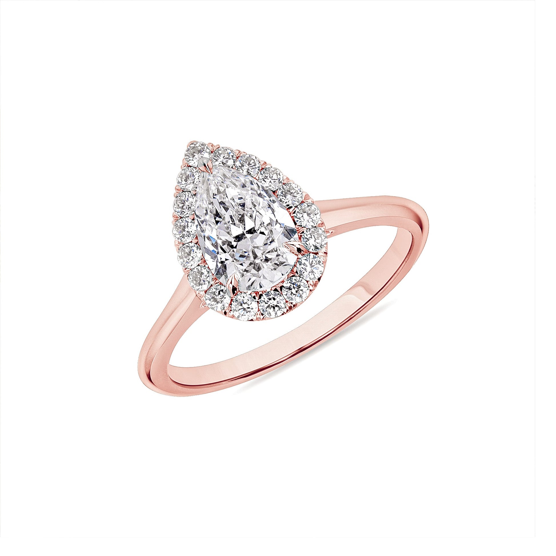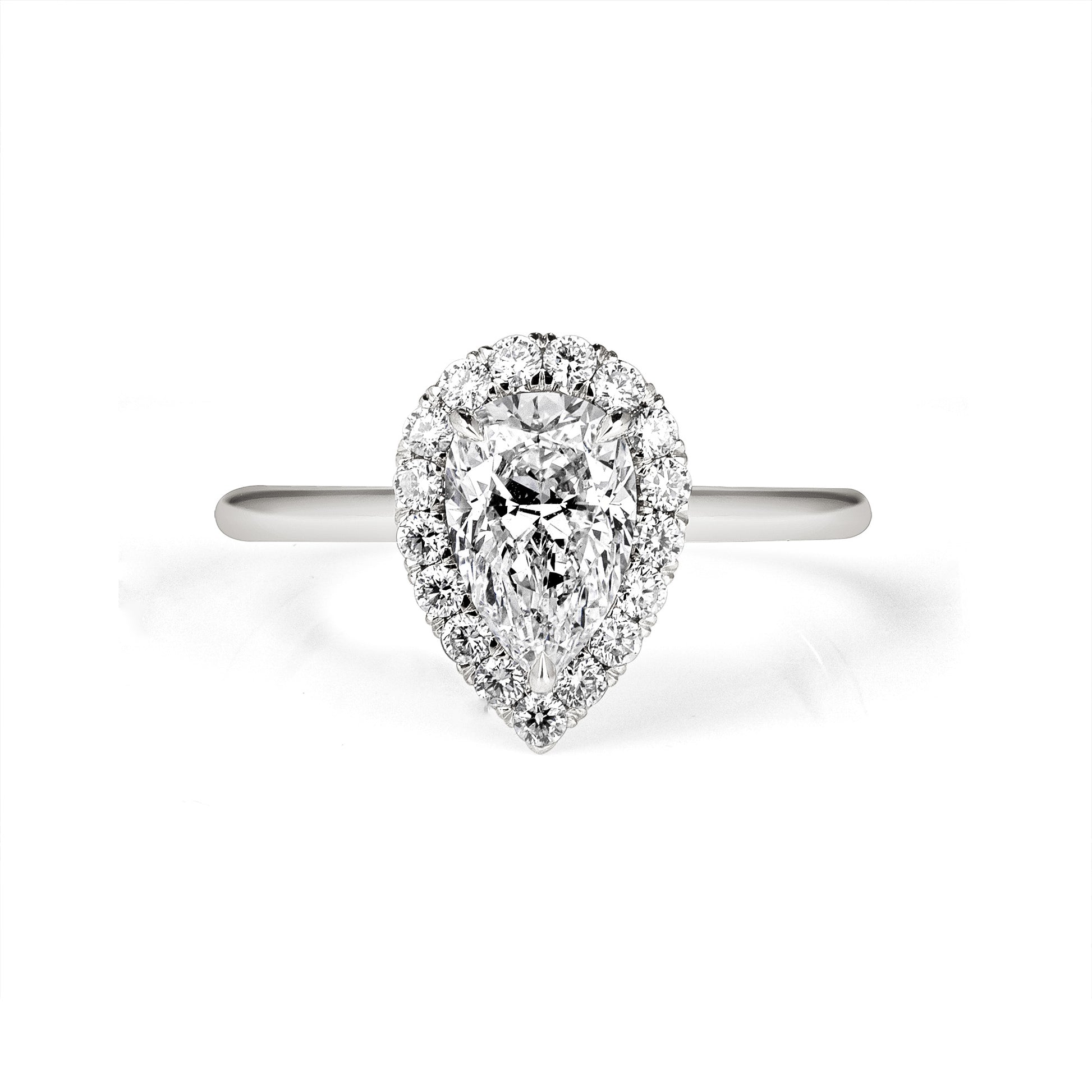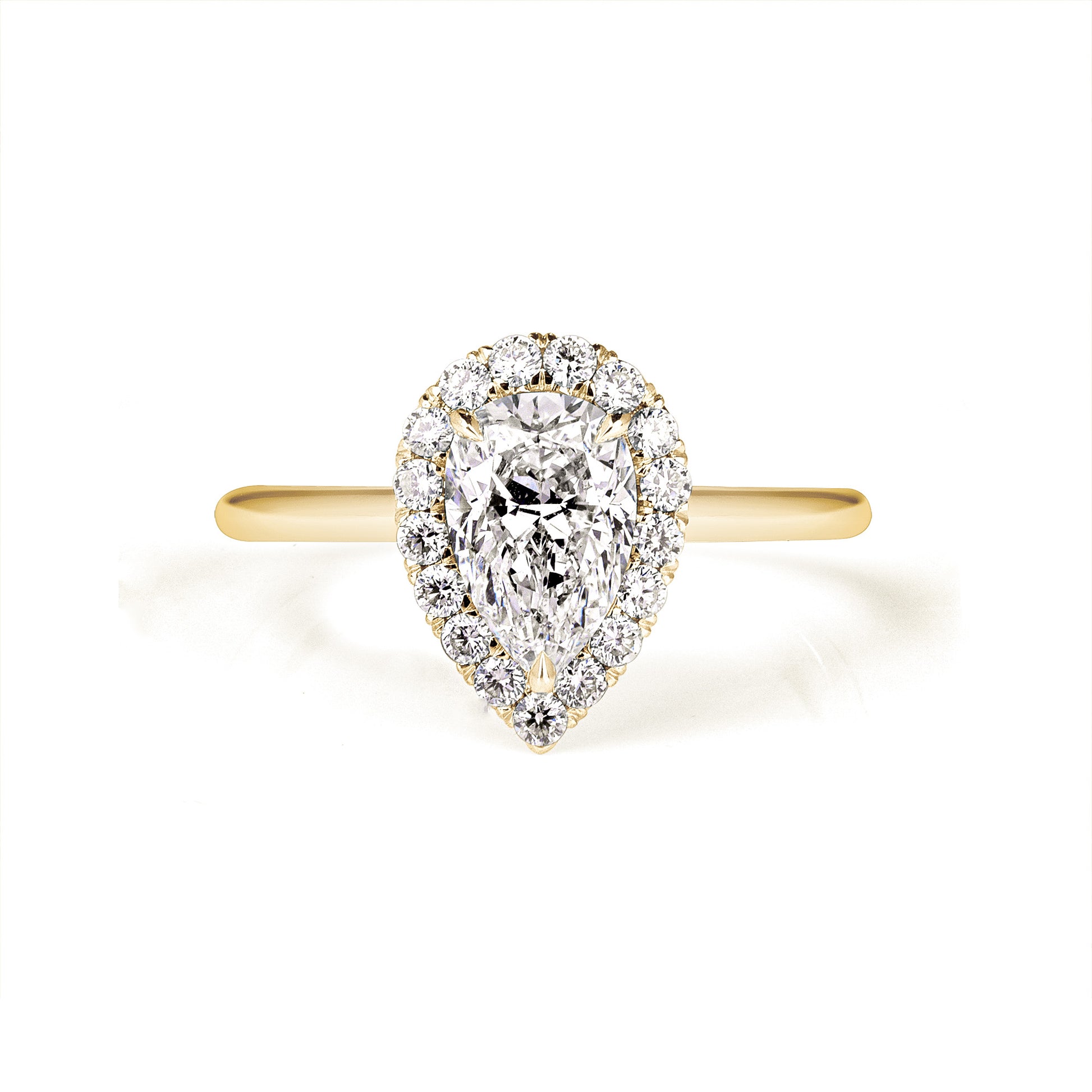 This pear-shaped halo engagement ring offers a striking blend of elegance and individuality, making it a standout choice for a modern love story. Its elongated shape and sparkling halo create a graceful, eye-catching profile. A perfect pick for those looking for a romantic ring with a bold presence.
