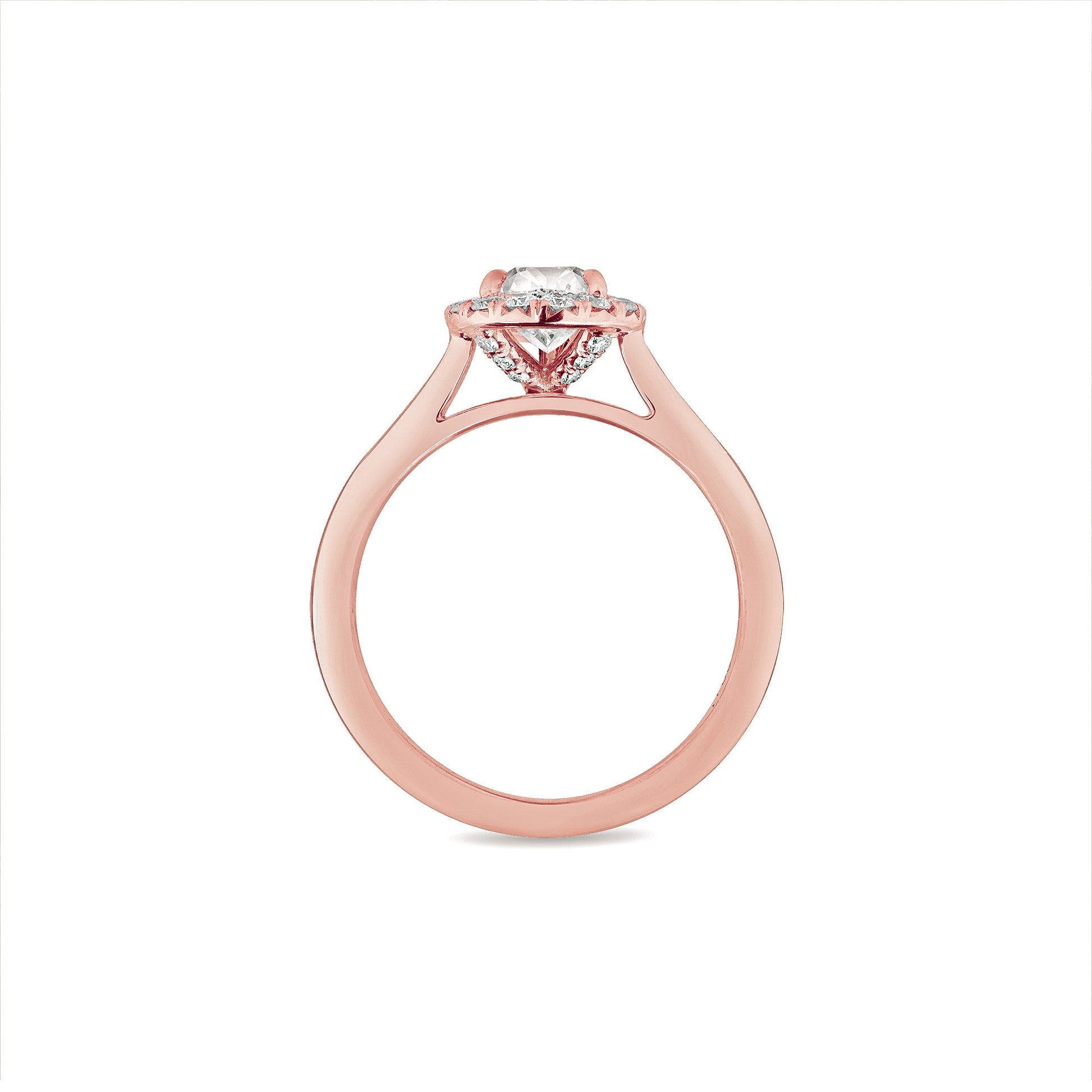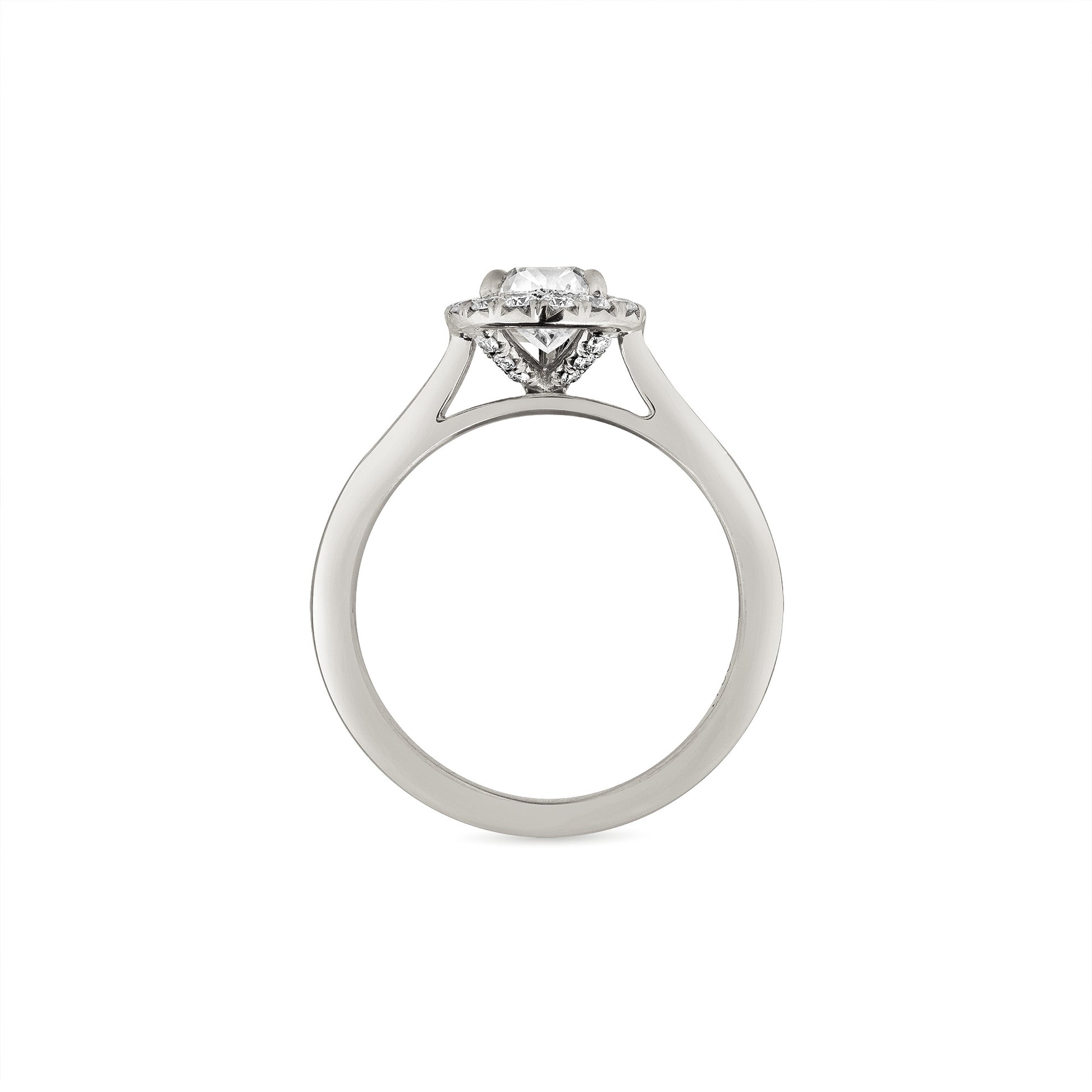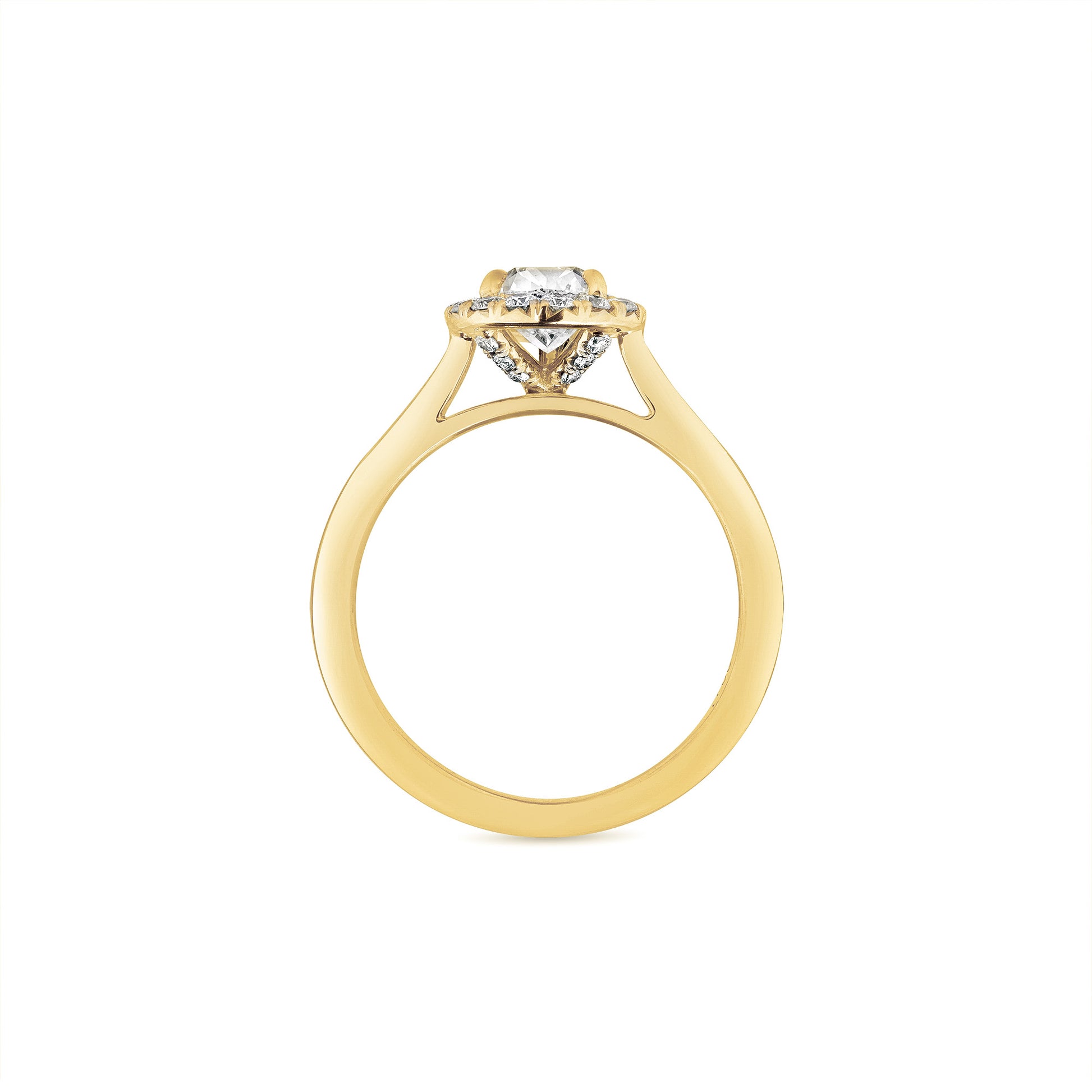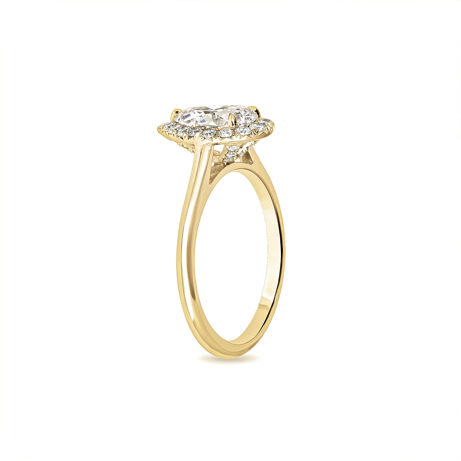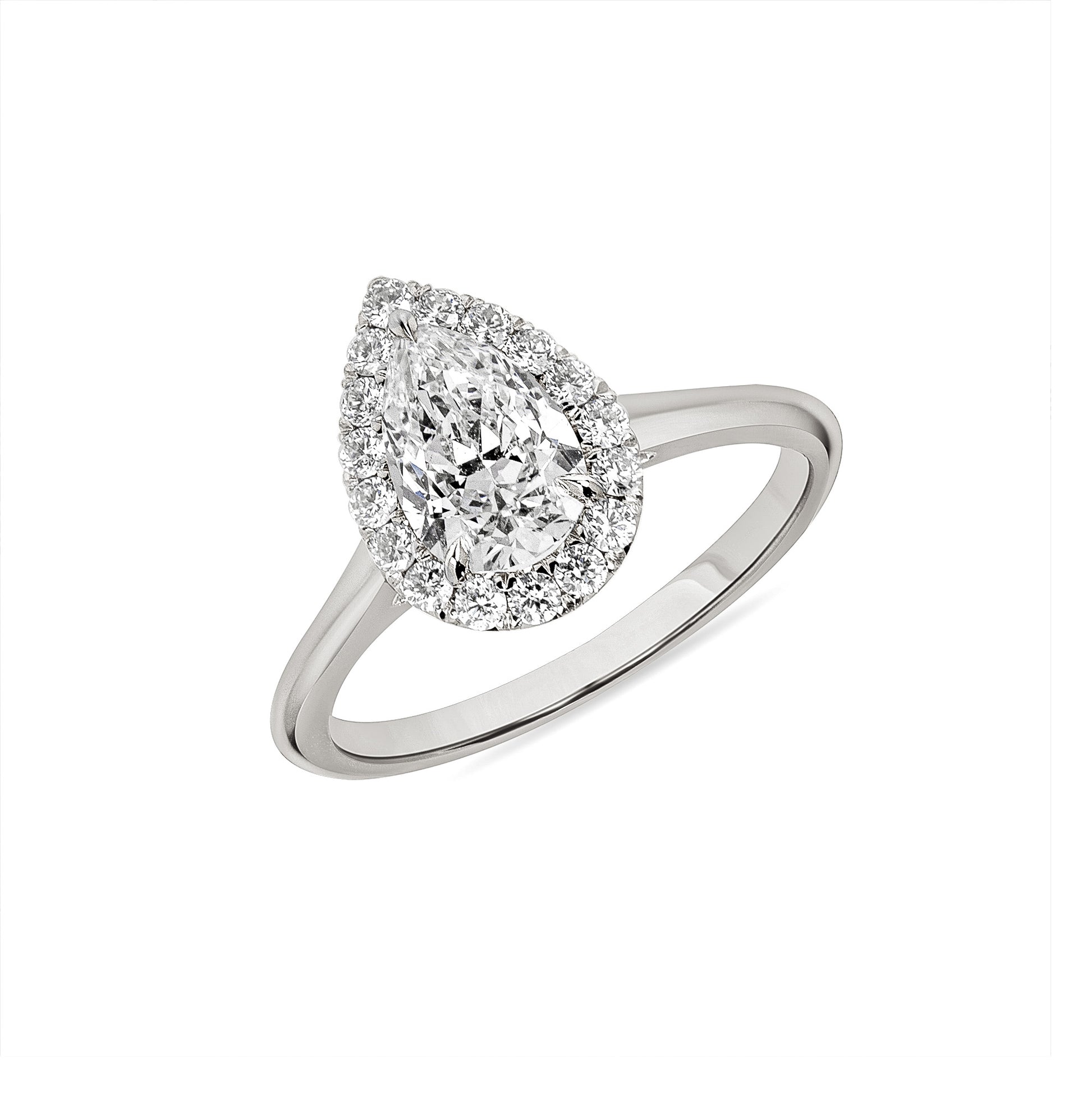 This pear-shaped halo engagement ring offers a striking blend of elegance and individuality, making it a standout choice for a modern love story. Its elongated shape and sparkling halo create a graceful, eye-catching profile. A perfect pick for those looking for a romantic ring with a bold presence.