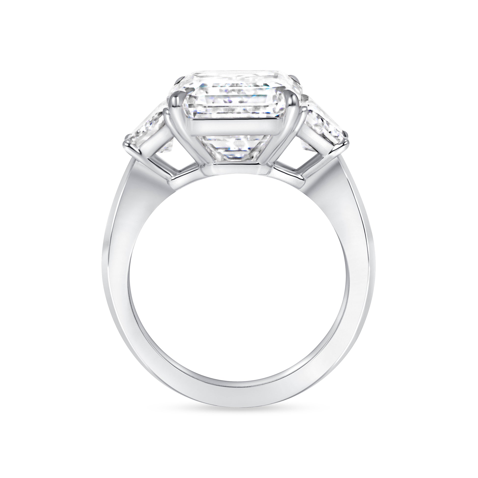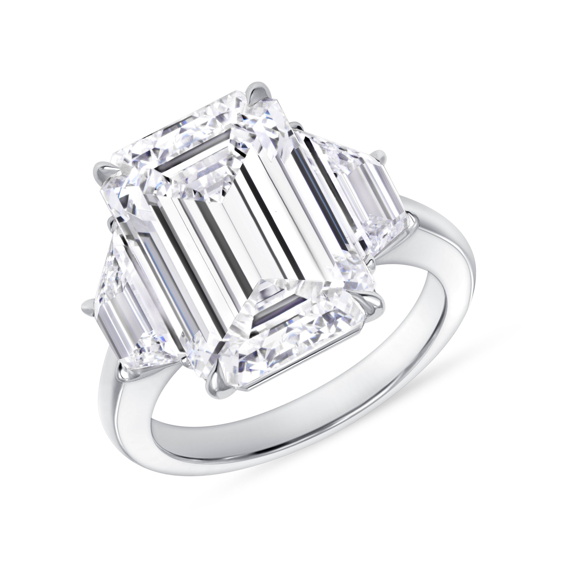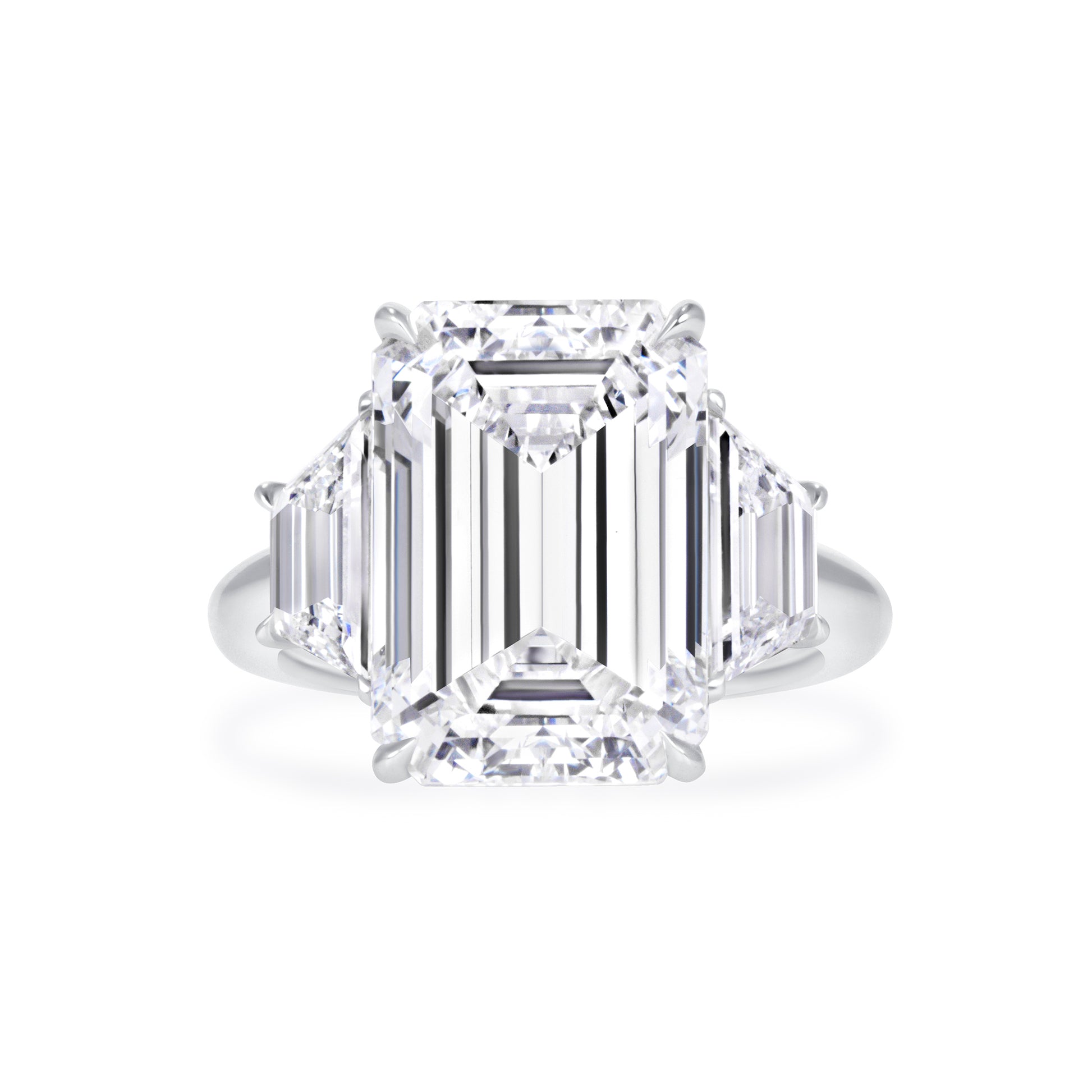 A dramatic and architectural statement, this emerald cut three-stone engagement ring is designed for bold sophistication. The commanding center stone is flanked by perfectly matched trapezoid accents, creating a striking geometric silhouette.