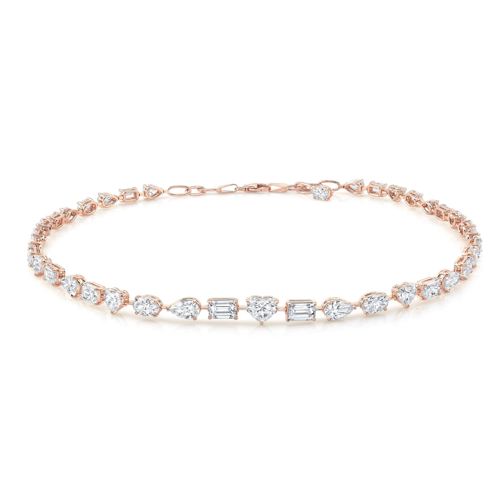 A radiant symphony of shapes, this necklace features an elegant procession of round, pear, emerald, and heart-shaped diamonds, each set in warm rose gold. The artful arrangement of mixed cuts creates a mesmerizing play of brilliance and form, blending classic elegance with contemporary allure.