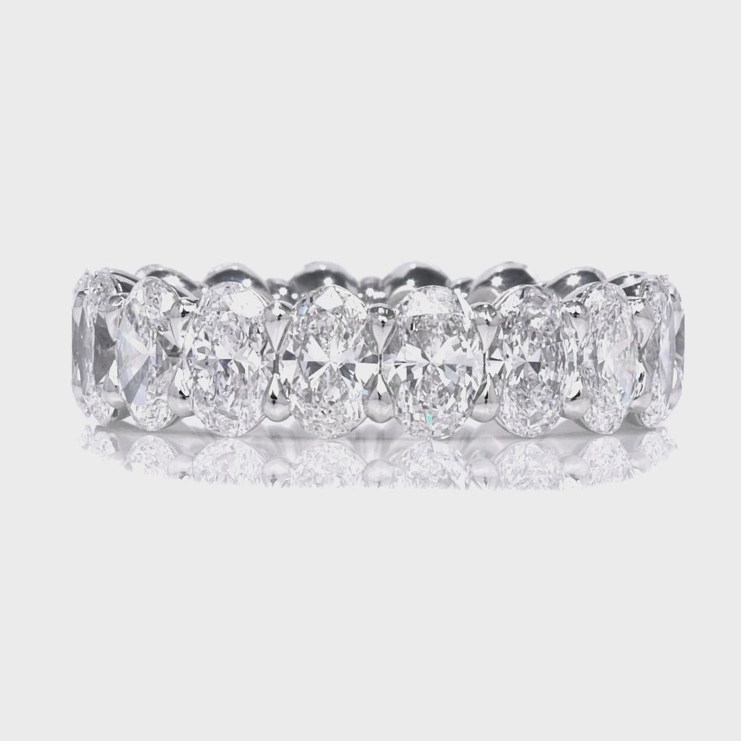 This oval diamond eternity band features a continuous circle of meticulously matched stones, each set to create a smooth, uninterrupted flow around the finger. The elongated shapes are positioned in close succession, forming a graceful contour that enhances their natural brilliance and visual impact.